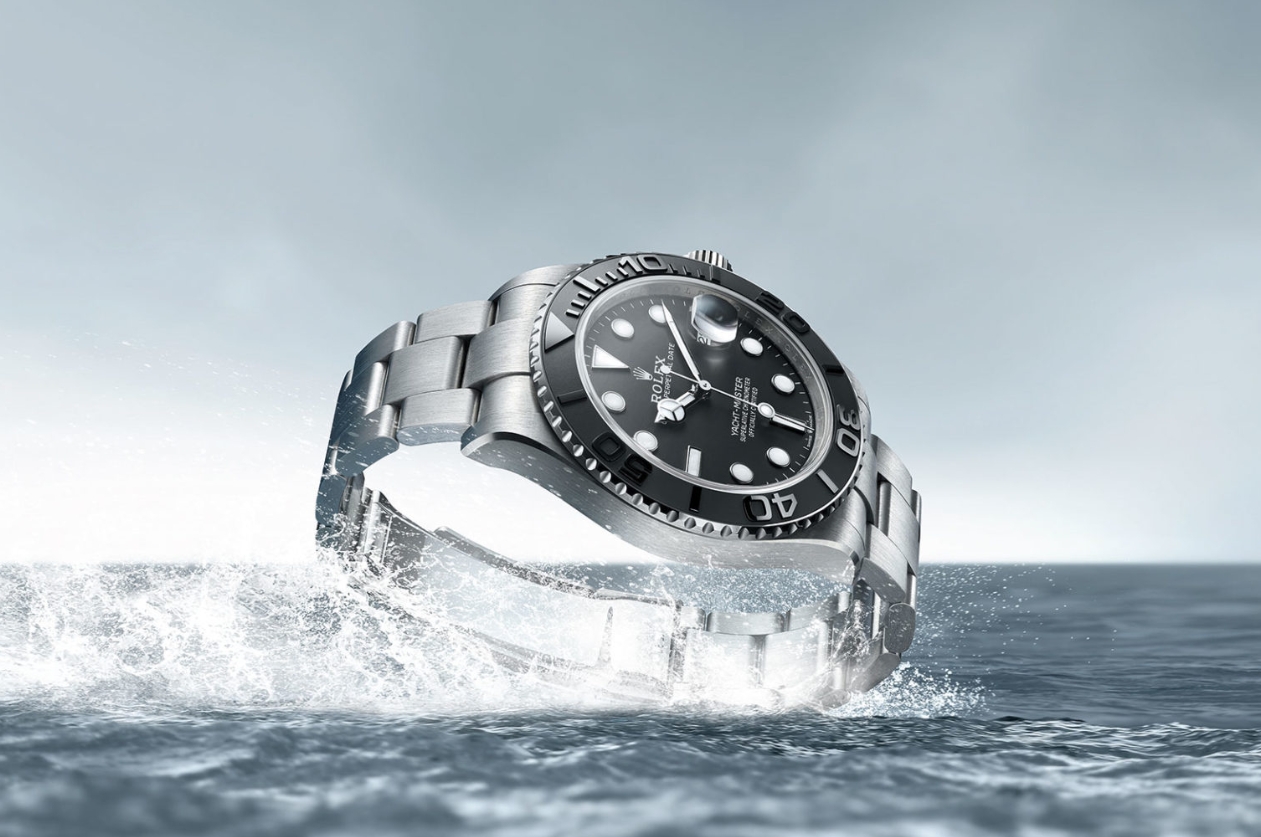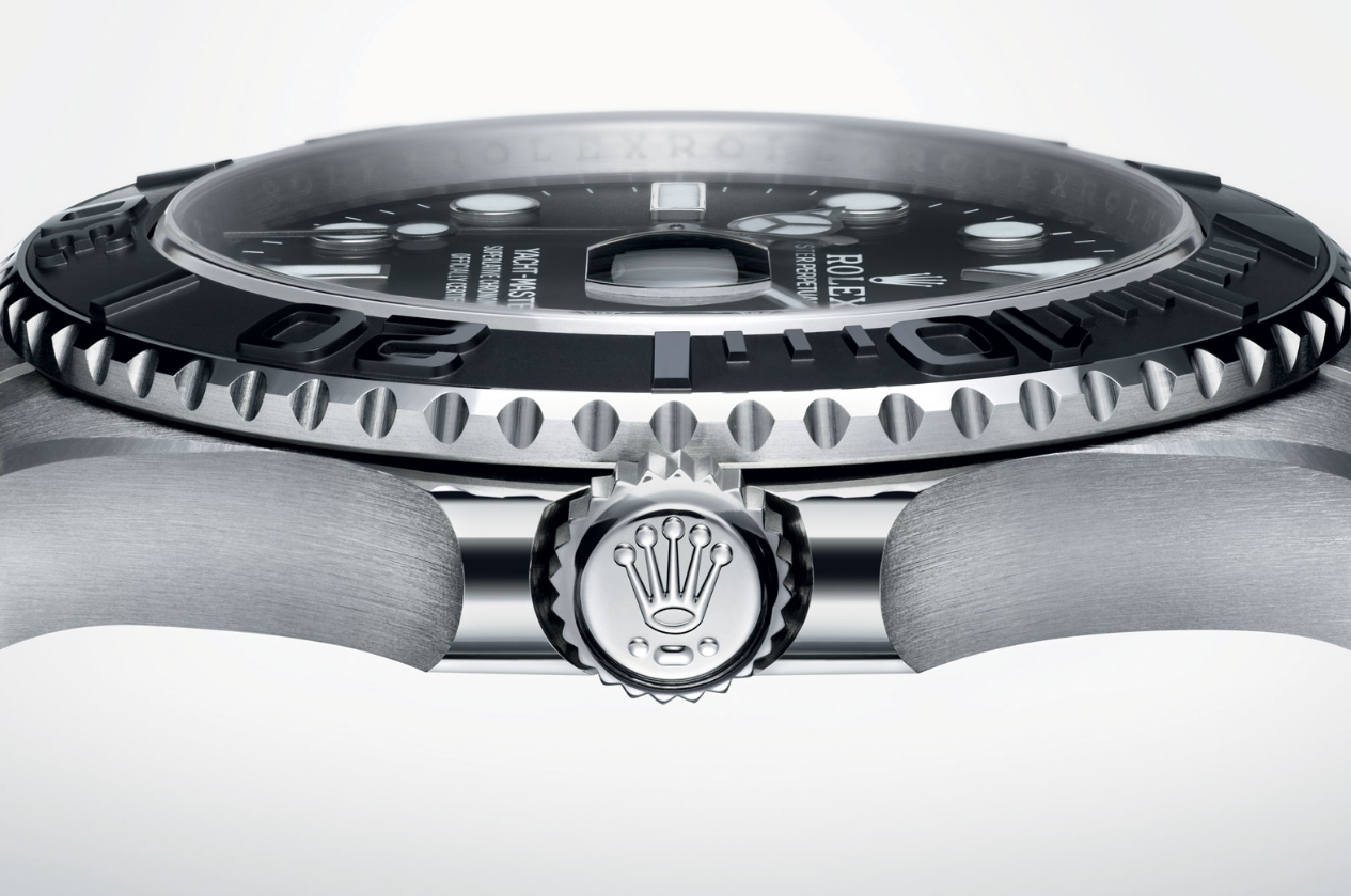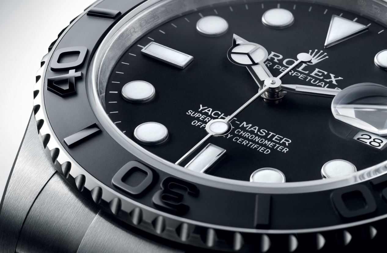 The bi-directional rotating bezel features a Cerachrom insert with relief markings, a trademark feature of the Yacht-Master line. To complete the black ceramic bezel is a dial finished in a matte black, which contrasts sharply with the hour and minute markers and hands filled with luminous Chromalight.